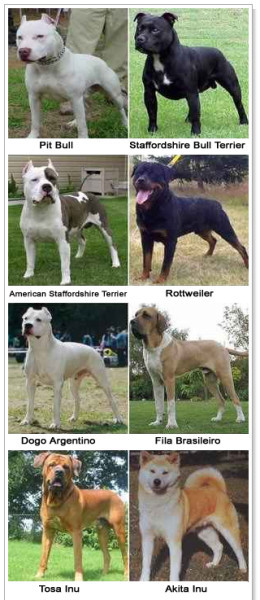 Pit bull, Rottweiler, Staffordshire Bull Terrier, American Staffordshire, Dogo argentino, Fila Brasileiro, Tosa Inu y Akita Inu + razas con características recogidas en el Real Decreto 287/2002